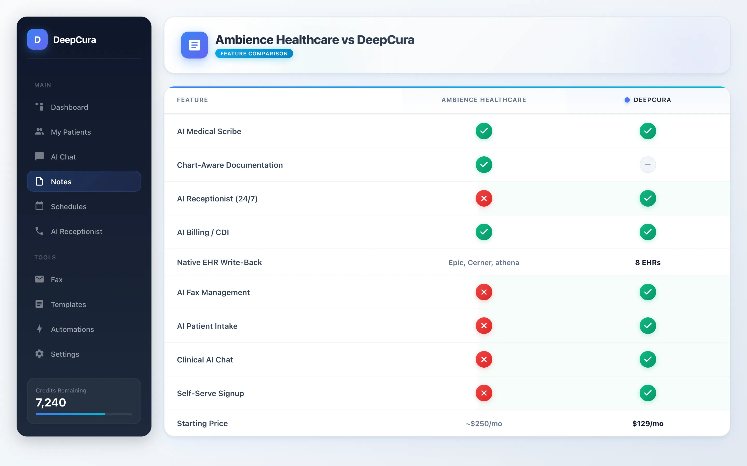 At the base tier alone, Ambience costs roughly 2x what a full-platform solution like DeepCura charges — and DeepCura includes native EHR write-back across 8 systems, an AI receptionist, billing automation, fax management, and patient intake for $129/month. For the full Ambience suite, the gap widens to roughly 3x the cost, and Ambience still does not include patient communication, fax management, or intake automation.