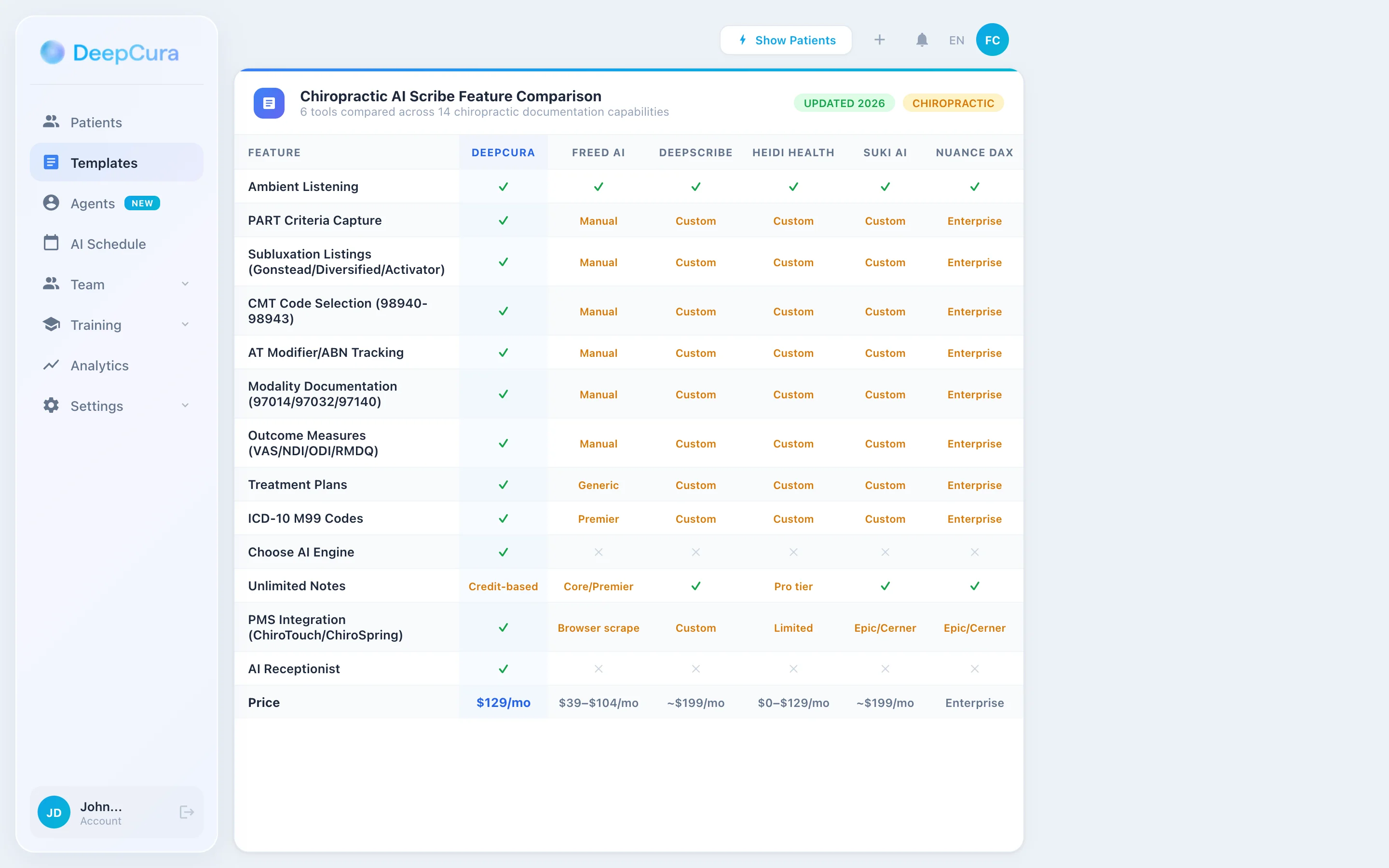 Verdict: DeepCura is the strongest choice for chiropractic practices that need PART criteria structure, technique-specific listings, CMT code differentiation, and AT modifier handling at a per-provider price point that is economically viable at solo and small group scale. The flexibility cost is upfront setup time, but the per-user pricing and unlimited notes make it the strongest fit for chiropractic at scale.