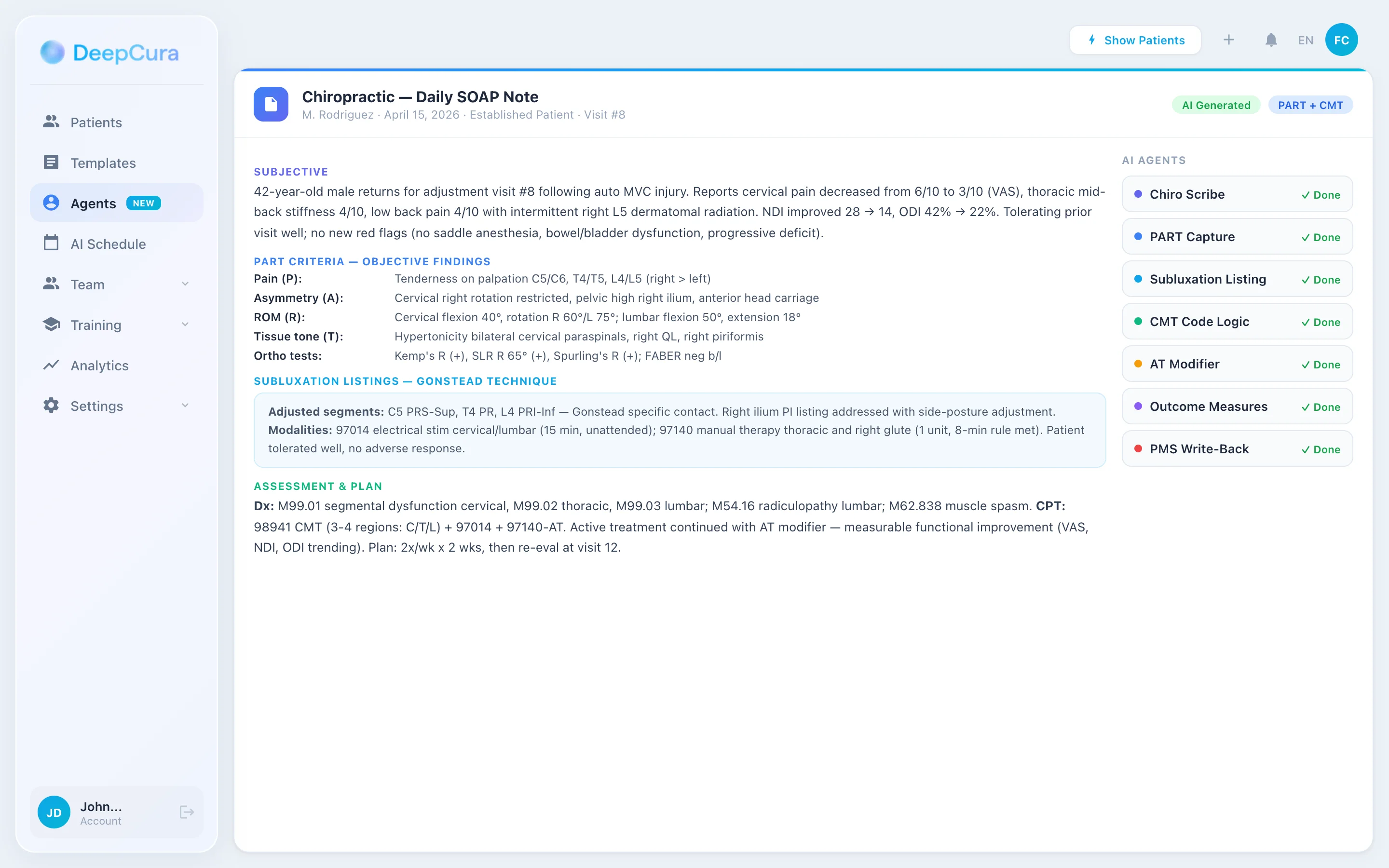 Watch how DeepCura handles the full chiropractic workflow — daily SOAP with PART criteria and subluxation listings, technique-specific documentation (Gonstead, Diversified, Activator), CMT code calculation, modality CPT alignment, AT modifier reasoning, and outcome measure integration.