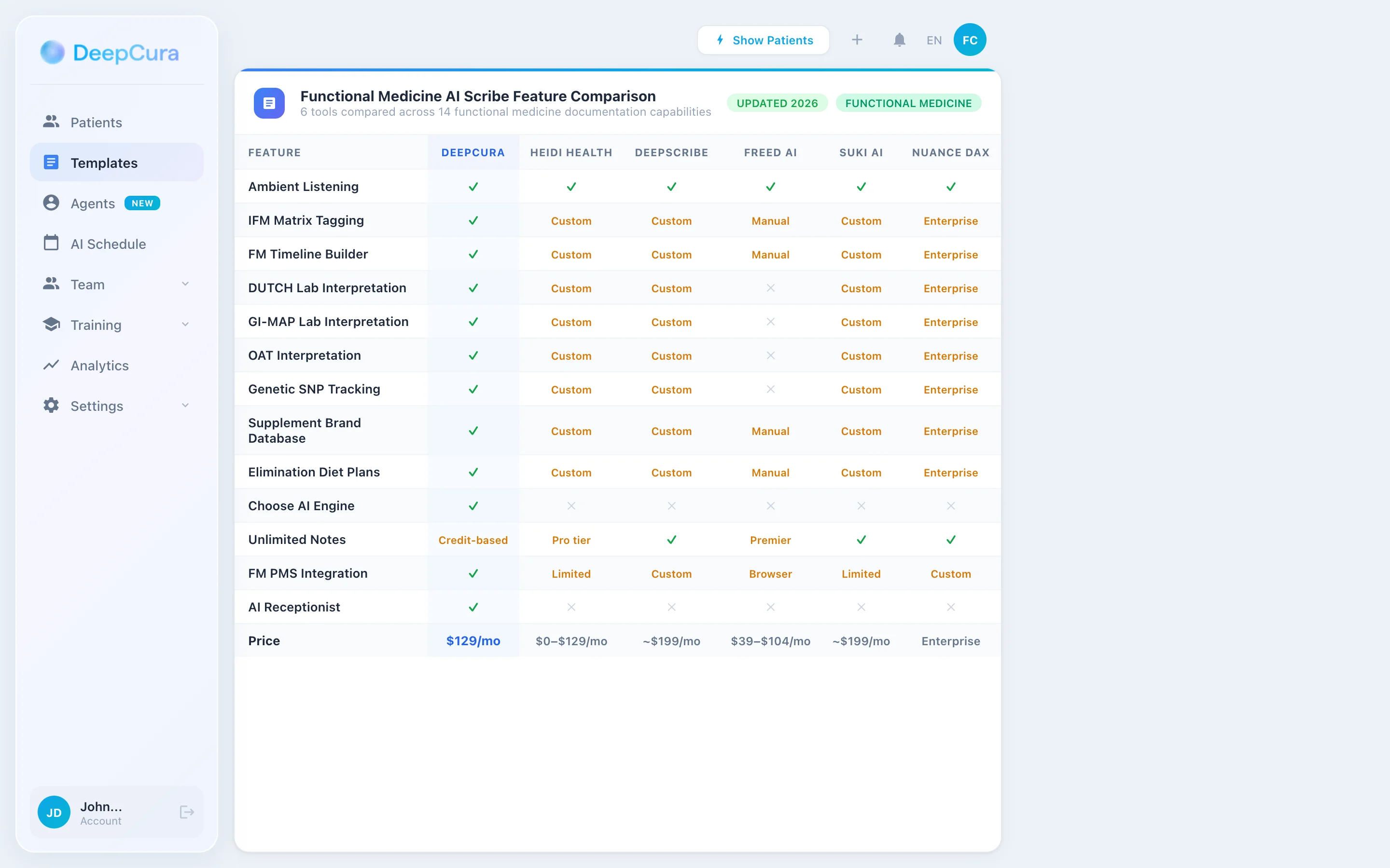 | DeepCura | $129/mo | Unlimited | ✓ Custom IFM Matrix/Timeline/Lab | Single plan, all features |