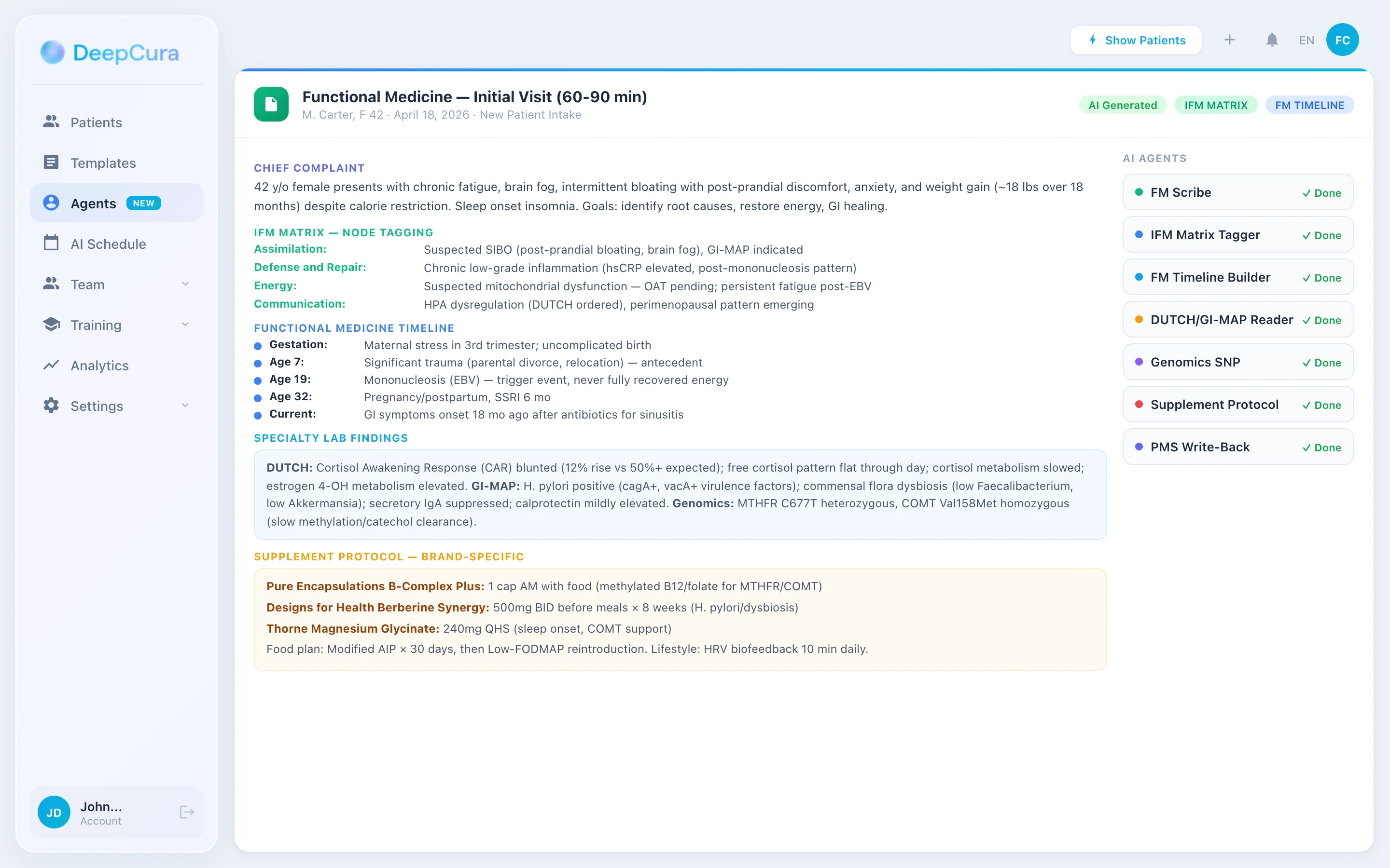 Watch how DeepCura handles the full functional medicine workflow — IFM Matrix mapping, Functional Medicine Timeline generation, DUTCH/GI-MAP/OAT lab interpretation, brand-specific supplement protocols, food plan documentation, validated assessment scoring, and patient-facing deliverable generation.