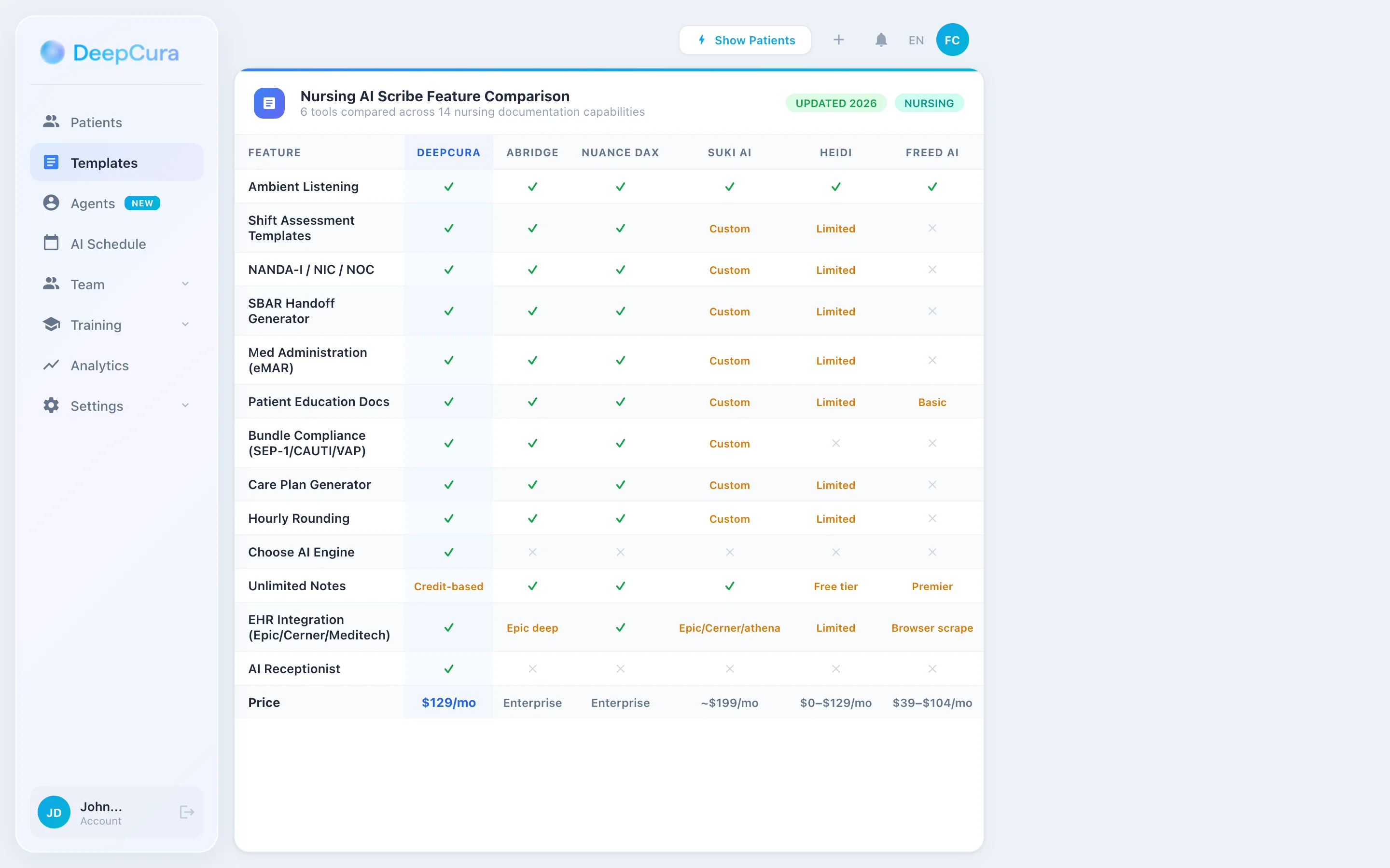 DeepCura is a customizable clinical AI platform that combines ambient scribing, clinical decision support, evidence search, practice automation, and bidirectional EHR integration — $129/month with unlimited notes. For nursing teams in ambulatory, hospital, home health, hospice, and school nurse settings — particularly those operating in independent practices, FQHCs, smaller hospitals, or as independent contractors — DeepCura's customizable templates and unlimited per-user notes deliver the strongest fit because no off-the-shelf scribe ships with NANDA-I/ADPIE/risk-scale structure out of the box.