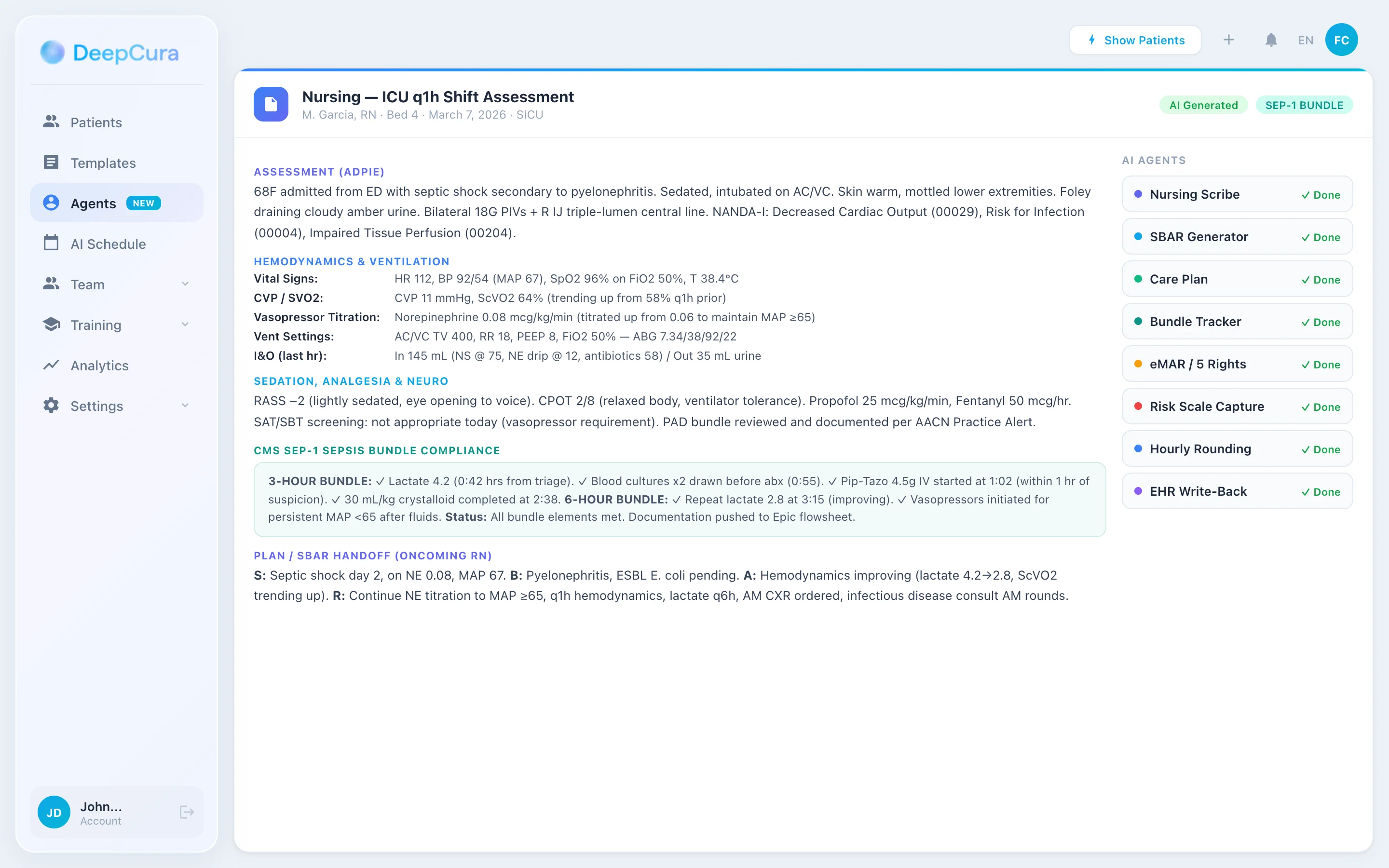 DeepCura templates for med-surg, ICU, ED, L&D, home health, and school nursing with NANDA-I, ADPIE, risk scales, SBAR, and SEP-1 bundle support — built for the nursing workflow. Start your free trial.