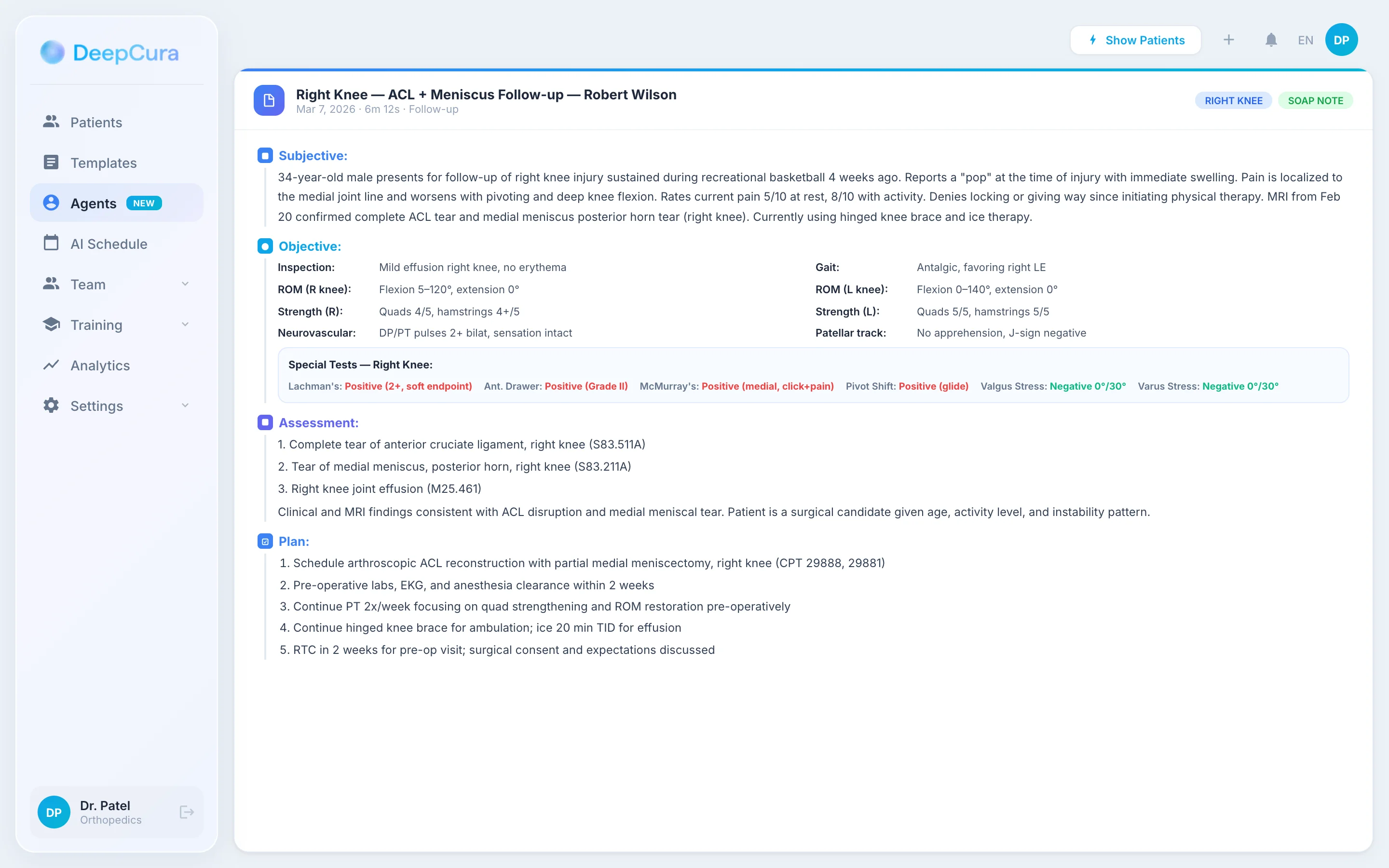 - ✓Special test recognition and structured documentation (McMurray's, Lachman's, Neer's, Hawkins, etc.)