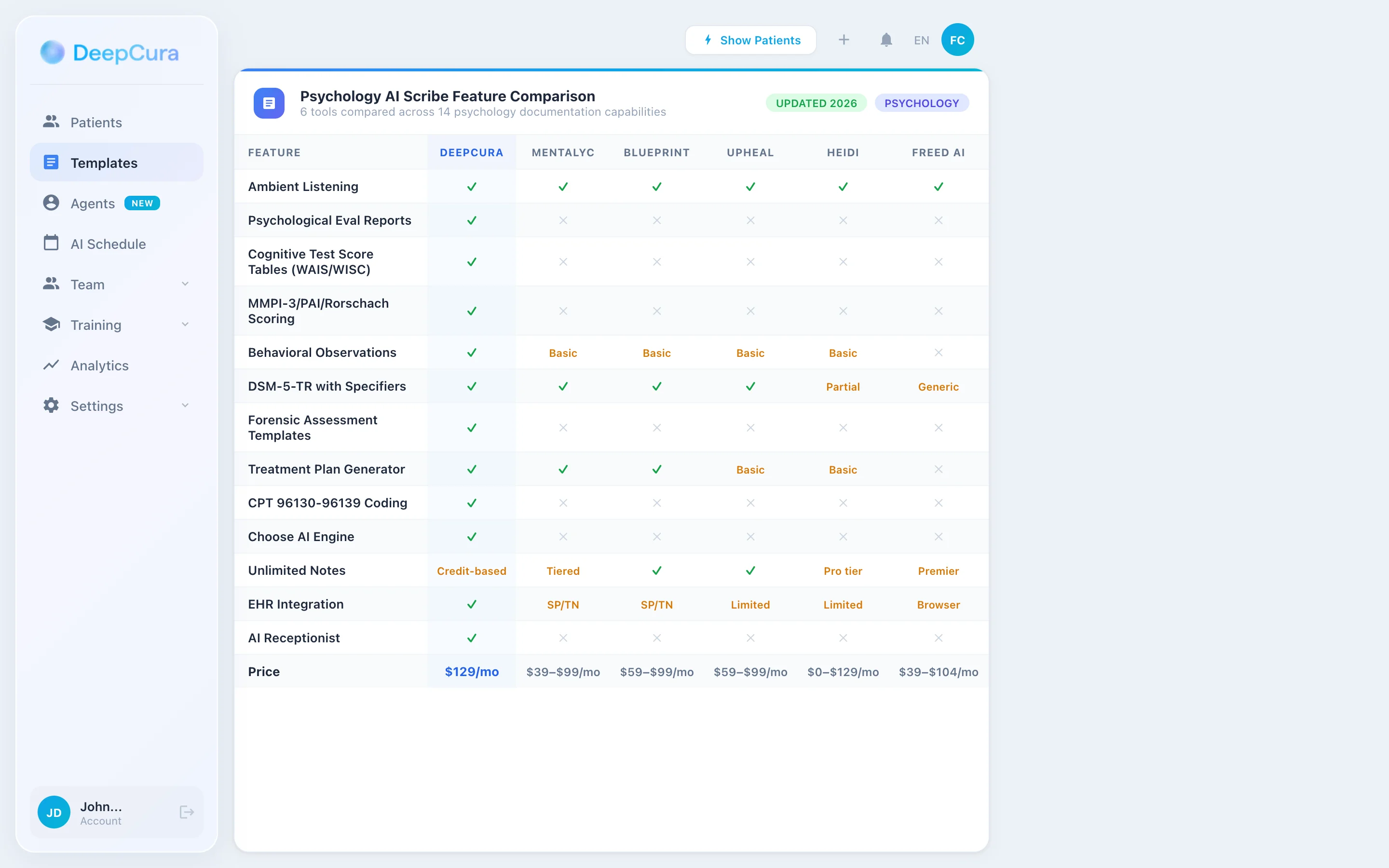 DeepCura is a customizable clinical AI platform that combines ambient scribing, clinical decision support, evidence search, practice automation, and bidirectional EHR integration — $129/month with unlimited notes. For clinical psychologists in independent practice — particularly those running mixed therapy-and-testing caseloads, neuropsychologists, child and adolescent psychologists, and forensic psychologists — DeepCura's customizable templates deliver a strong fit because no off-the-shelf therapy-AI tool supports the long-form integrated report architecture.