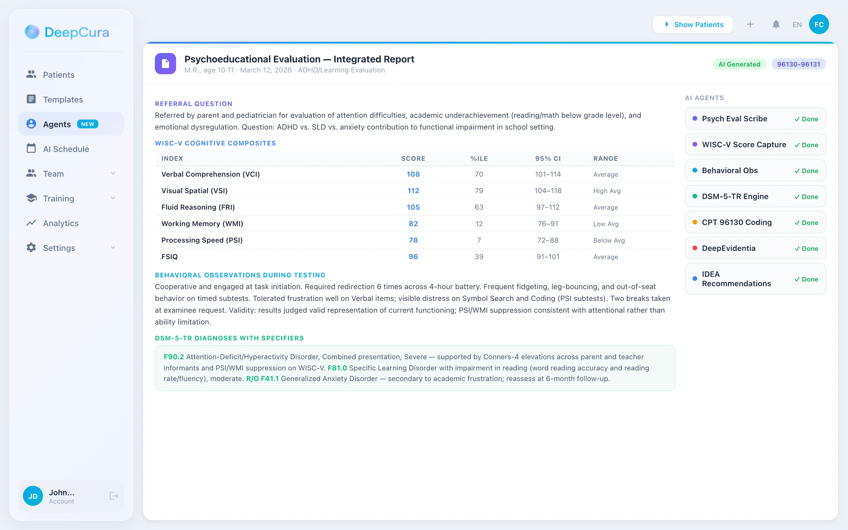 DeepCura's 15-credit long-form report engine takes raw scores, behavioral observations, and collateral data and produces an integrated multi-section evaluation report with DSM-5-TR diagnoses and audience-aligned recommendations. Start your free trial.