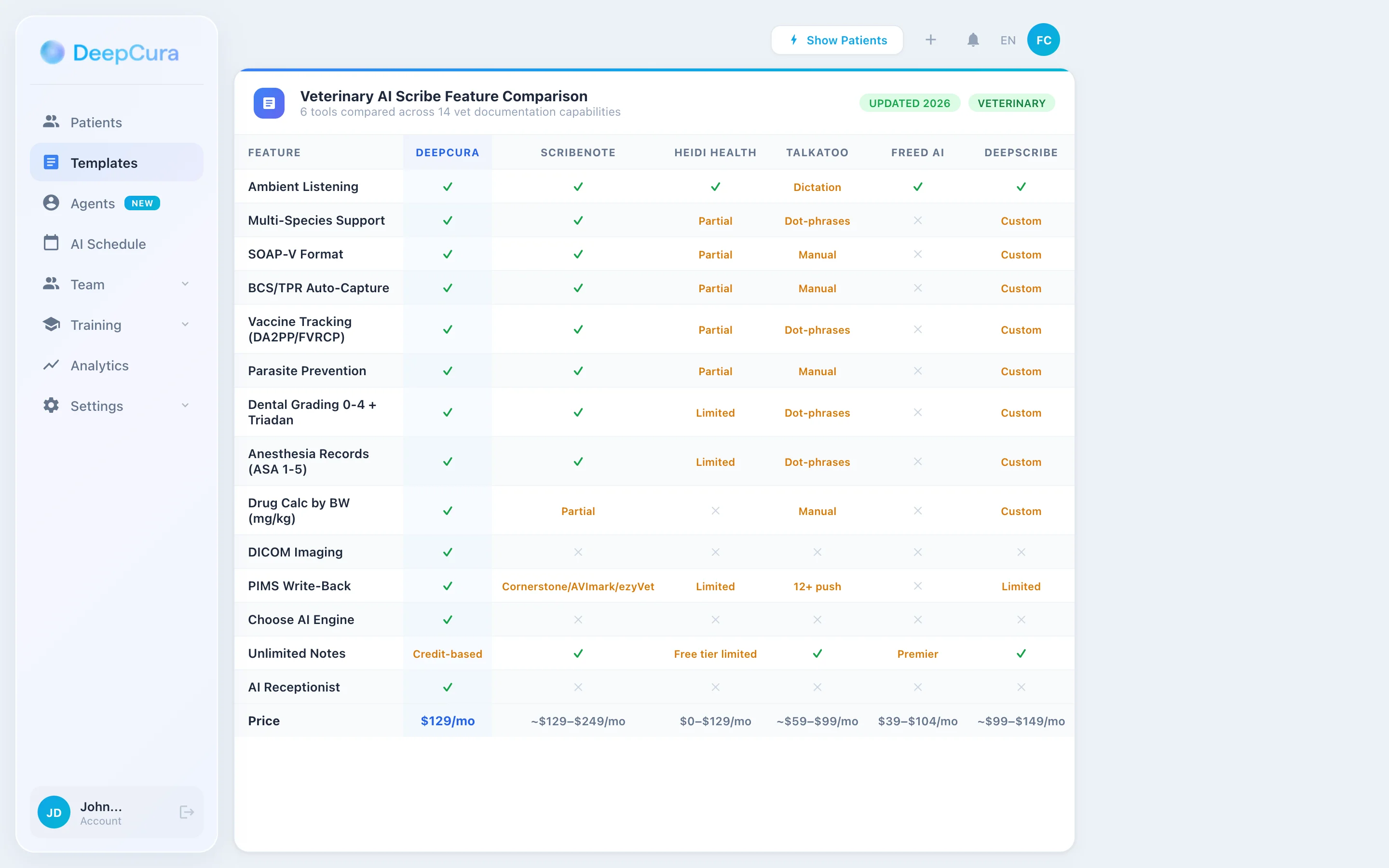 DeepCura is a customizable clinical AI platform that combines ambient scribing, clinical decision support, evidence search, practice automation, and bidirectional EHR integration — $129/month with unlimited notes. While DeepCura is designed primarily for human medicine, its custom template builder and AI receptionist make it the strongest cross-specialty option for veterinary practices that want one platform to handle scribing, client phone triage, and documentation across mixed-species caseloads.