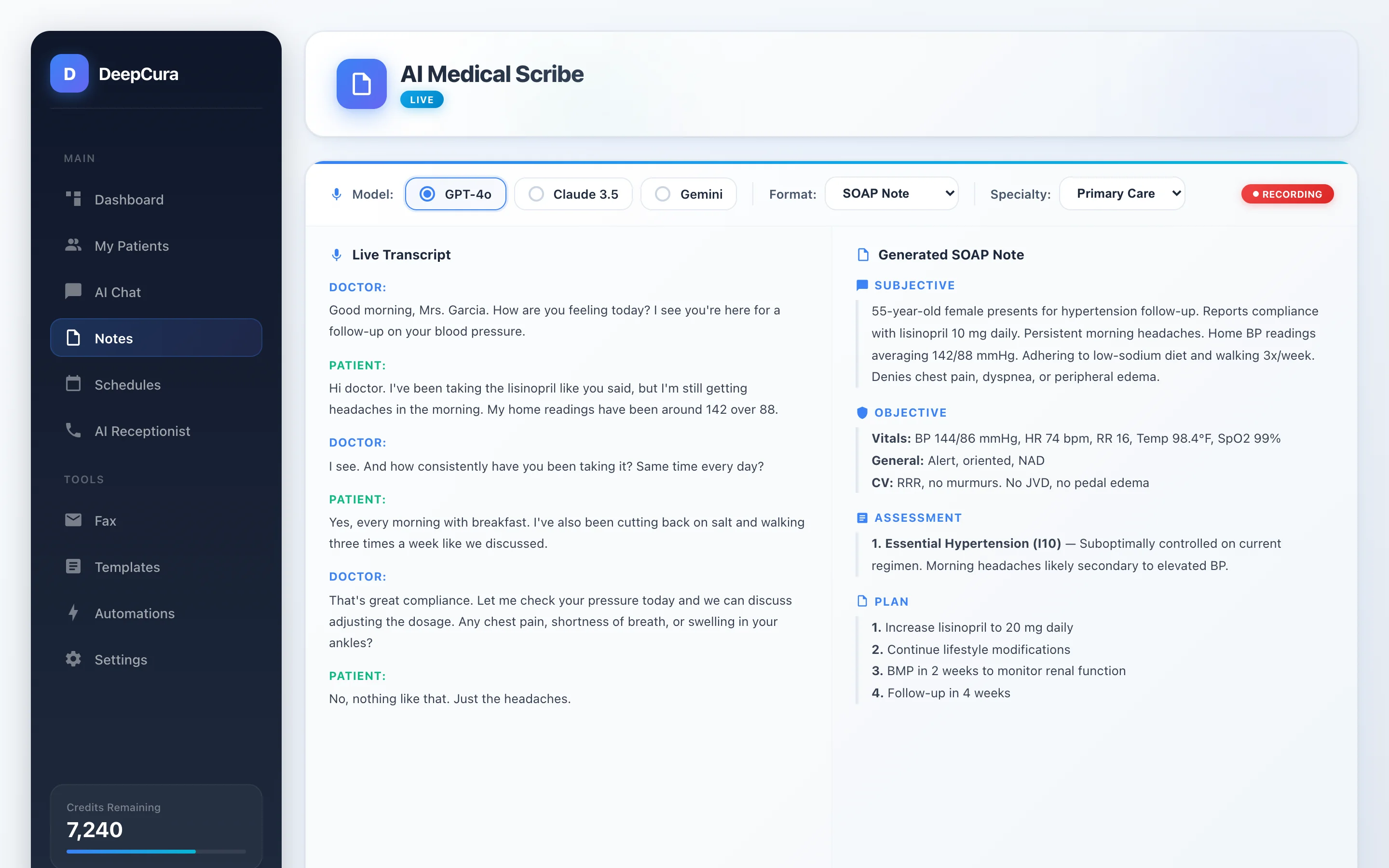 Screenshot: DeepCura AI scribe — ambient dictation with choice of AI engine (GPT, Claude, Gemini).