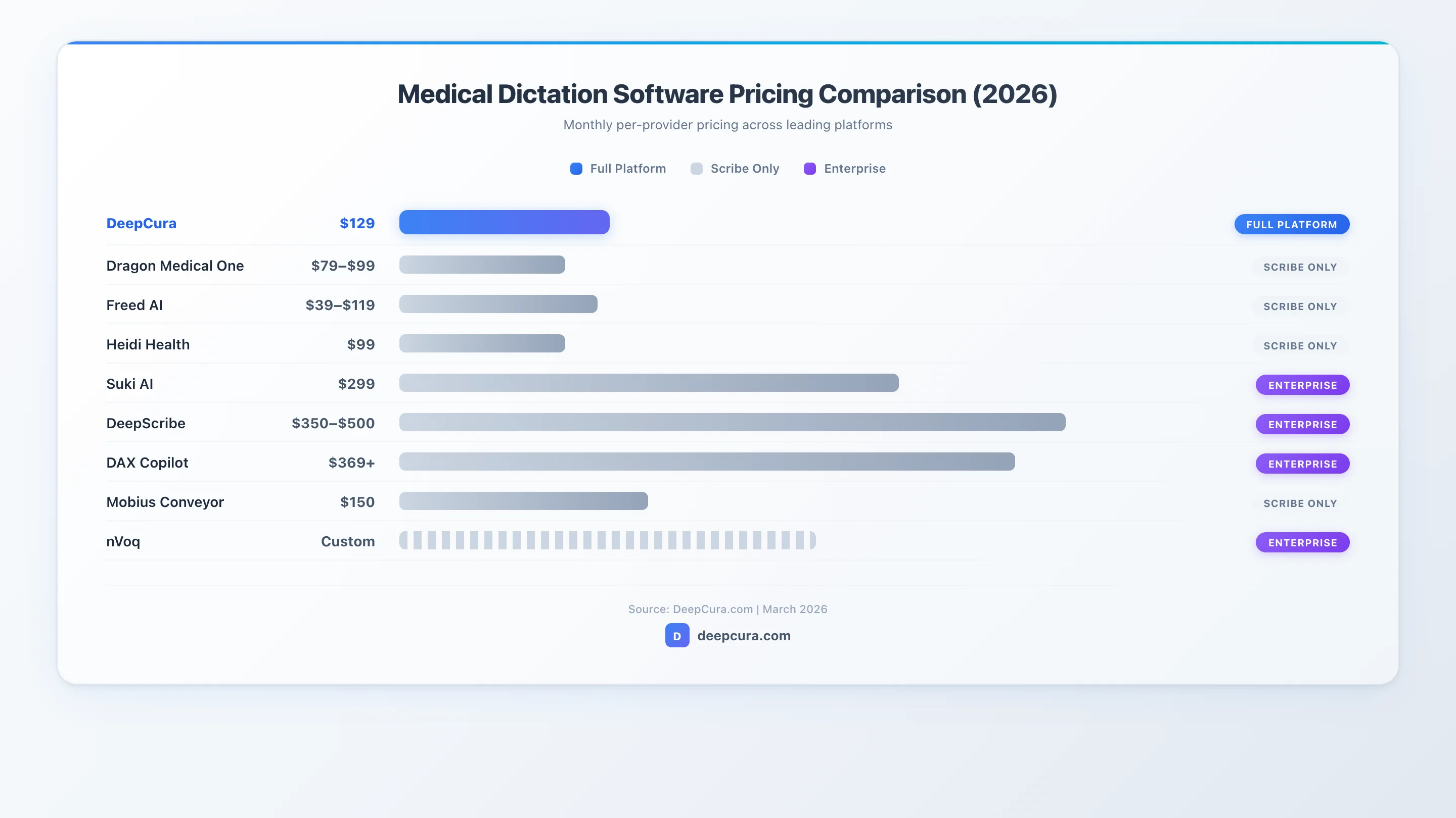 The pricing landscape for medical dictation software in 2026 splits into three tiers. Budget-tier tools like Freed AI start at $39/month but limit functionality to basic scribing. Mid-tier tools like Dragon Medical One ($79-$99), Heidi Health ($99), and DeepCura ($129) offer more complete feature sets at accessible price points. Enterprise-tier tools like Suki AI ($299), Nuance DAX Copilot ($369+), and DeepScribe (custom) command premium pricing with narrower feature sets or enterprise-only availability.